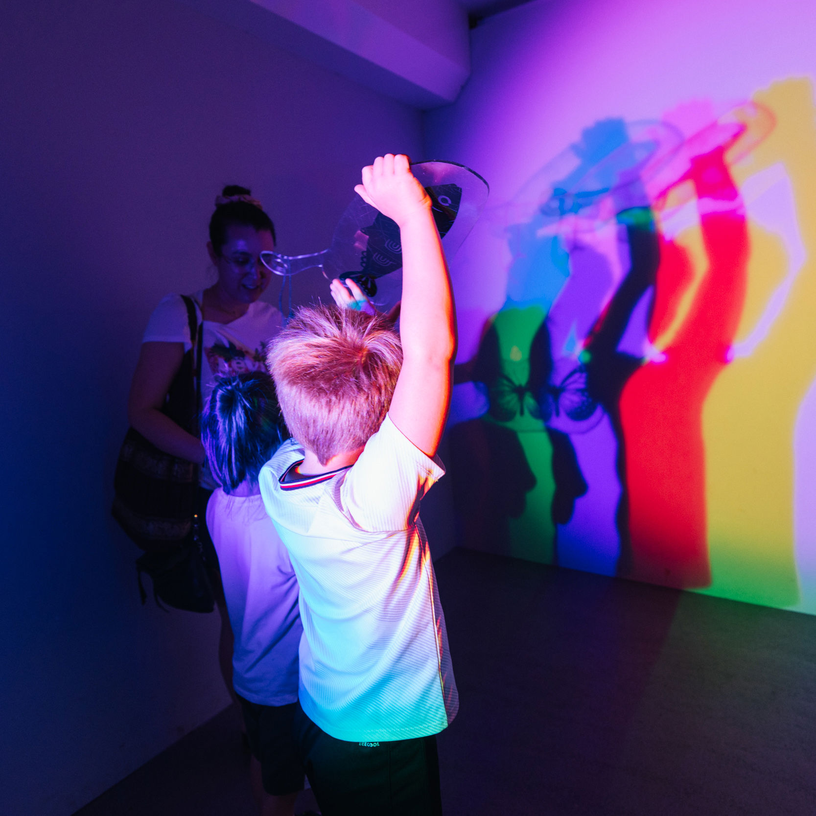 I farveskyggerummet kan I bruge jeres egne kroppe til at eksperimentere med farveskygger, og lave jeres helt eget farverige skyggeteater. I den hyggelige foyer kan I spille brætspil mens I spiser et lækkert stykke kage.