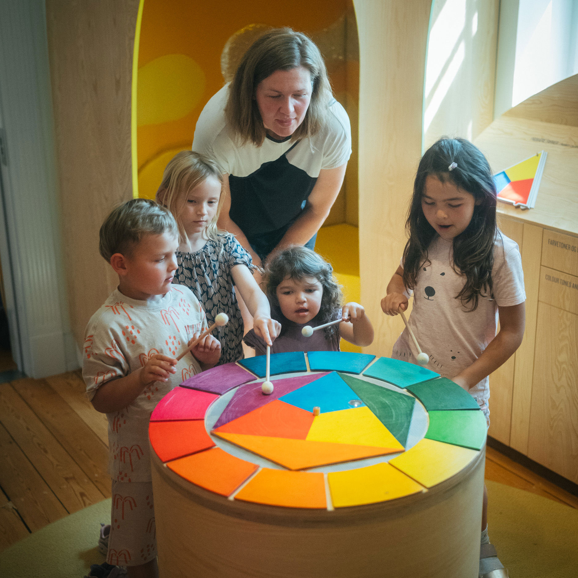 Oplev og leg med kunstens elementer i Sanseværk på Vejle Kunstmuseum. Her kan I lytte til det grønne, dufte til det blå, føle det gule og meget mere. Prøv at spille farveklange, lav øjebliksbilleder med lys og leg med former og farver. Kravl gennem hele farvecirklen, mærk formerne i et maleri og byg store skulpturer af finurlige væsner med Asger Jorns abstrakte former. Her er er der plads til leg, fantasi og masser af sjove fællesoplevelser for hele familien!