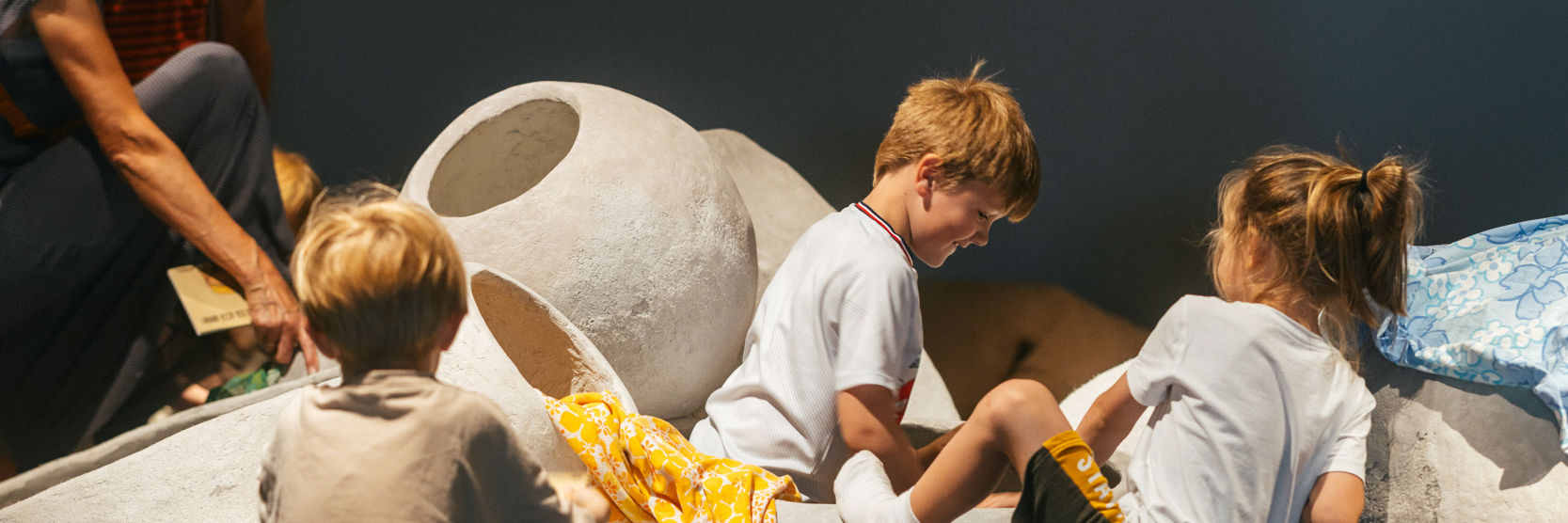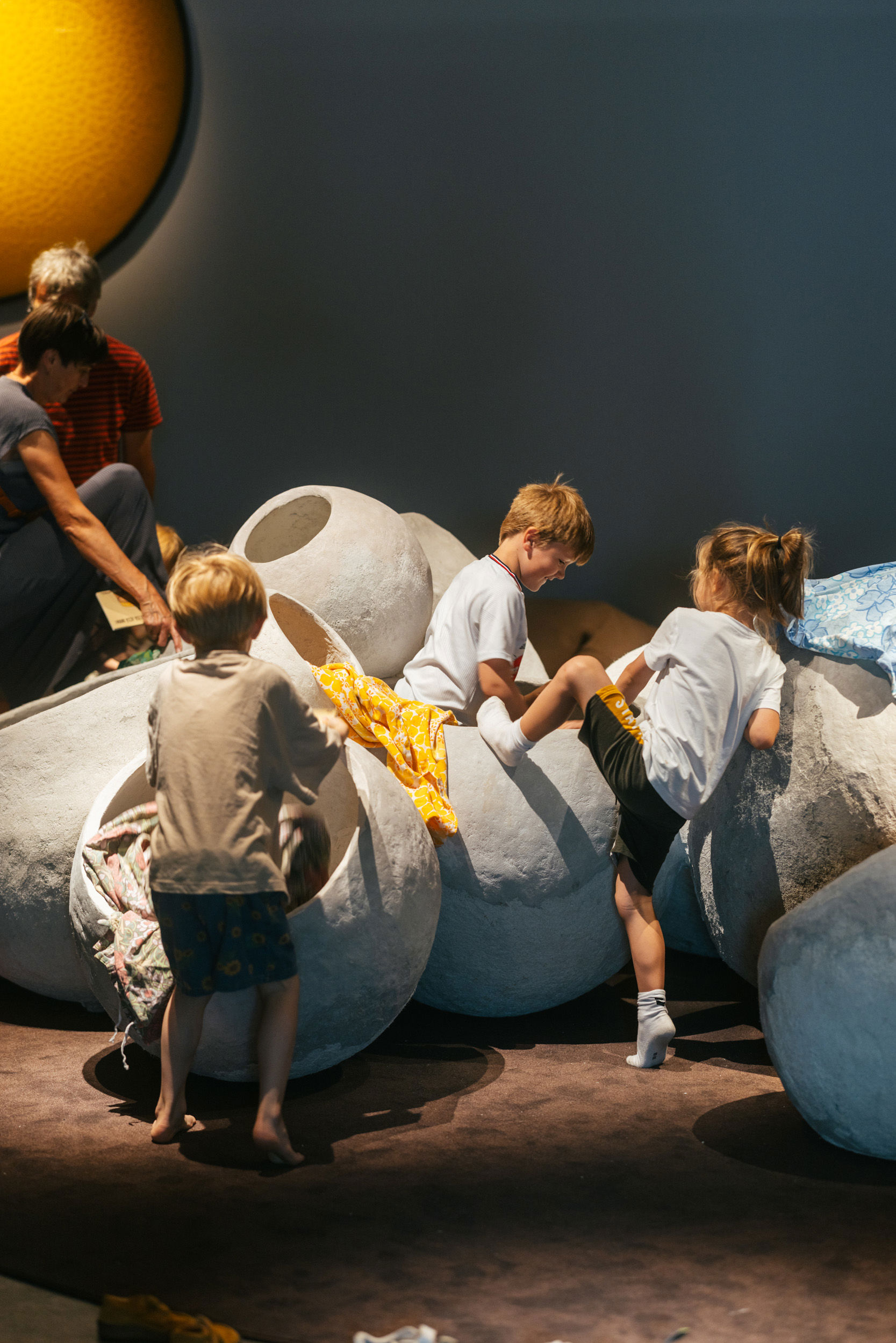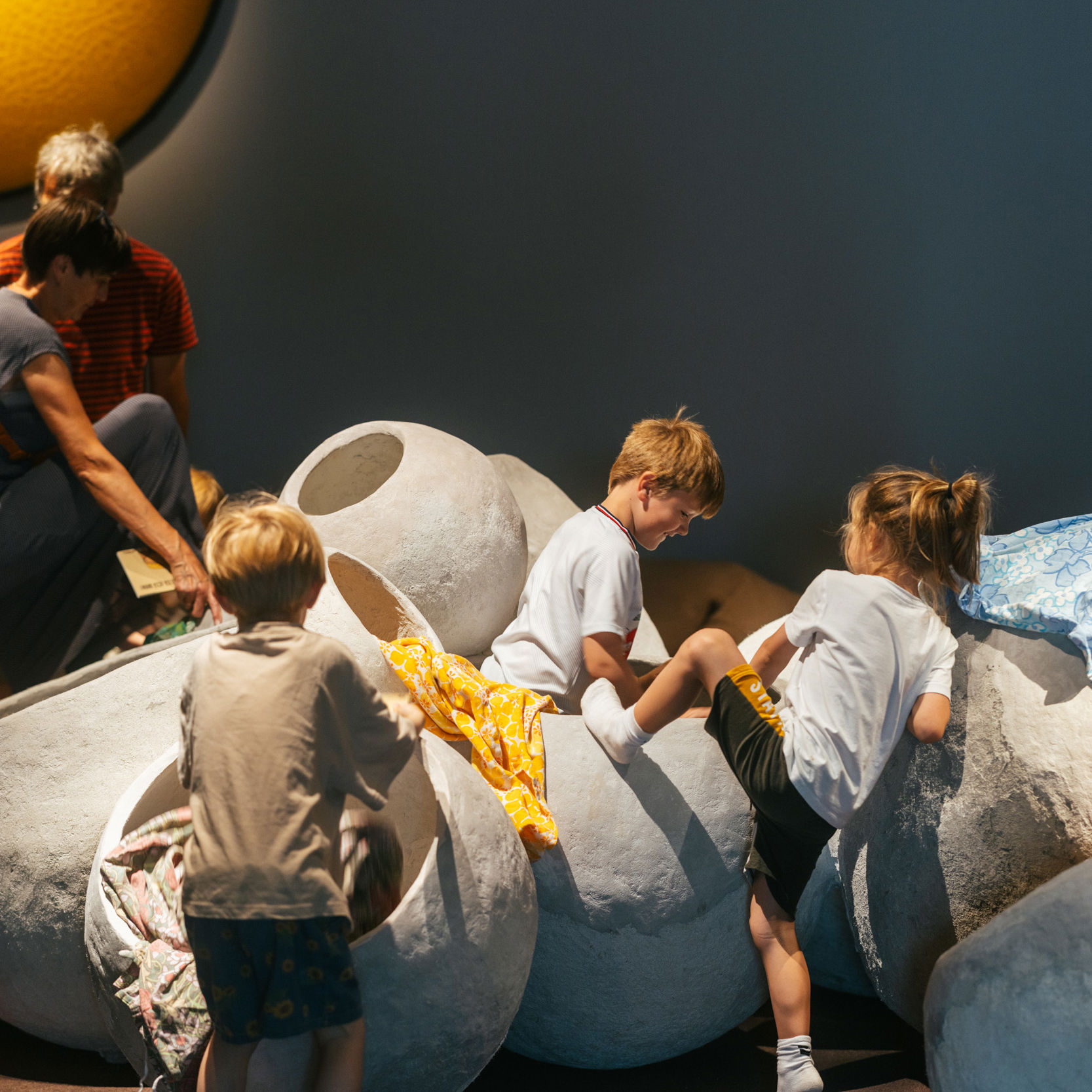 Gå på opdagelse i udstillingen Frugtbar og oplev kunsten på nye legende måder med vores sjove og sanselige aktivitetshjul. I udstillingen kan I også prøve at kravle ind i legeskulpturen Fertile Voids, dufte kunstværker og lære om anderledes frugtbarhedsmyter.