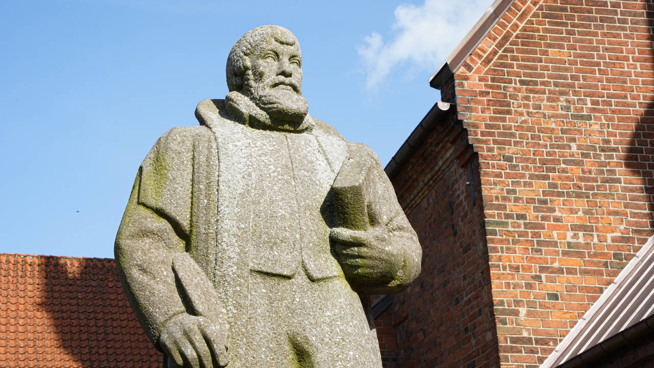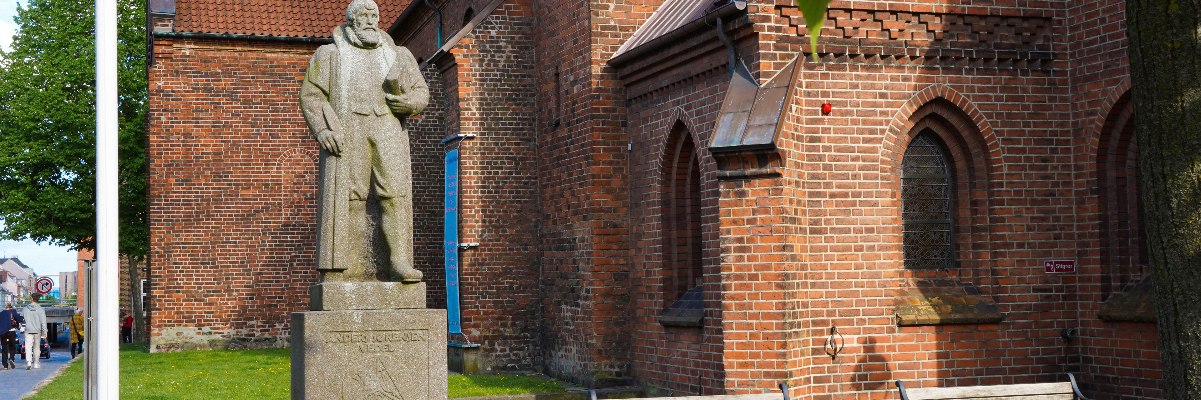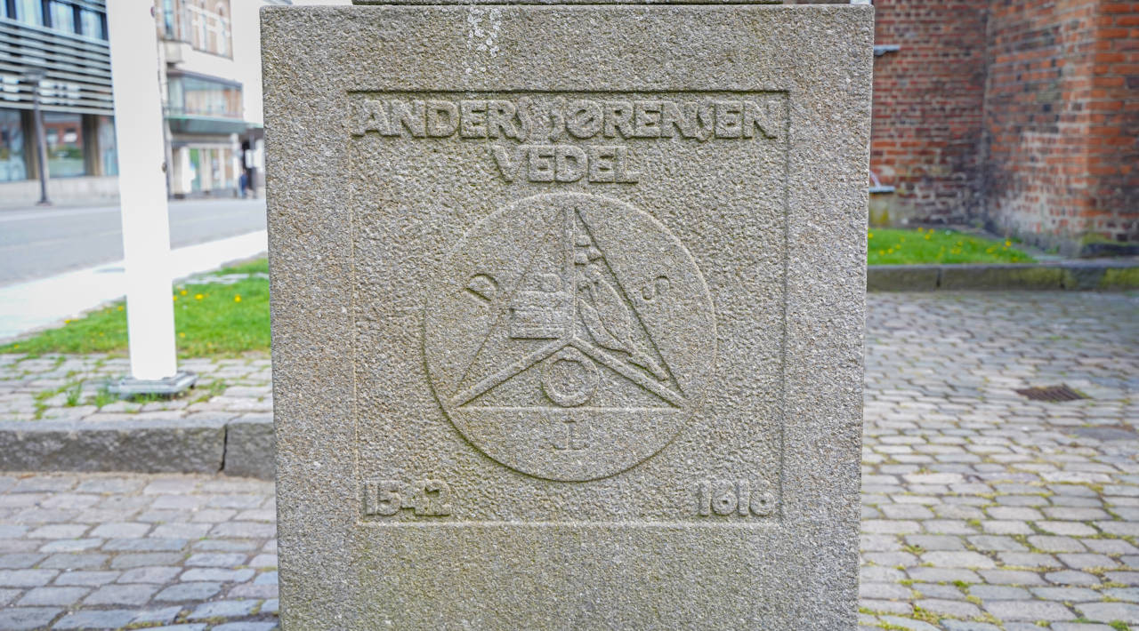 Statuen her på Kirketorvet er et monument over den danske præst og historiker Anders Sørensen Vedel (f. 1542 – 1616). Han var født og opvokset i Vejle, men tog i 1561 til København. Her opnåede han en magistergrad ved Wittenbergs universitet i 1566. Fra 1568 fungerede han som slotsprædikant ved Københavns Slot, og i starten af 1570'erne oversatte han Saxos "Gesta Danorum", fra latin til dansk. Gesta Danorum var en semi-fiktionel krønike over den danske historie indtil det sene 1100-tal, skrevet på latin og dermed kun læselig for de færreste i samfundet. Med en dansk version af denne, blev Danmarks historie gjort tilgængelig for mange flere, selvom kun et mindretal af danskere kunne læse og skrive, på denne tid. Gesta Danorum er et af de vigtigste og mest berømte værker fra den danske middelalderlitteratur.