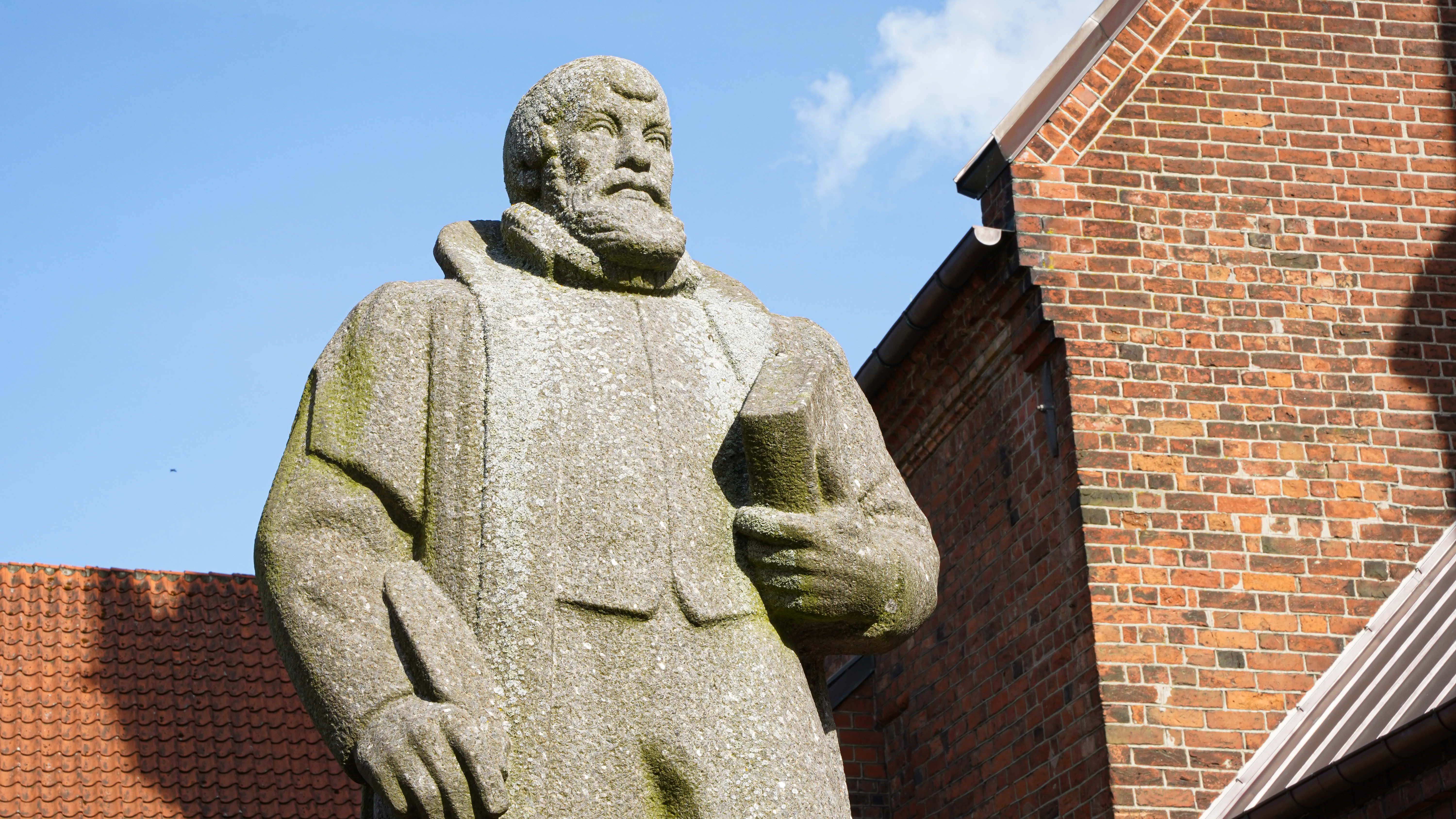 Statuen her på Kirketorvet er et monument over den danske præst og historiker Anders Sørensen Vedel (f. 1542 – 1616). Han var født og opvokset i Vejle, men tog i 1561 til København. Her opnåede han en magistergrad ved Wittenbergs universitet i 1566. Fra 1568 fungerede han som slotsprædikant ved Københavns Slot, og i starten af 1570'erne oversatte han Saxos "Gesta Danorum", fra latin til dansk. Gesta Danorum var en semi-fiktionel krønike over den danske historie indtil det sene 1100-tal, skrevet på latin og dermed kun læselig for de færreste i samfundet. Med en dansk version af denne, blev Danmarks historie gjort tilgængelig for mange flere, selvom kun et mindretal af danskere kunne læse og skrive, på denne tid. Gesta Danorum er et af de vigtigste og mest berømte værker fra den danske middelalderlitteratur.