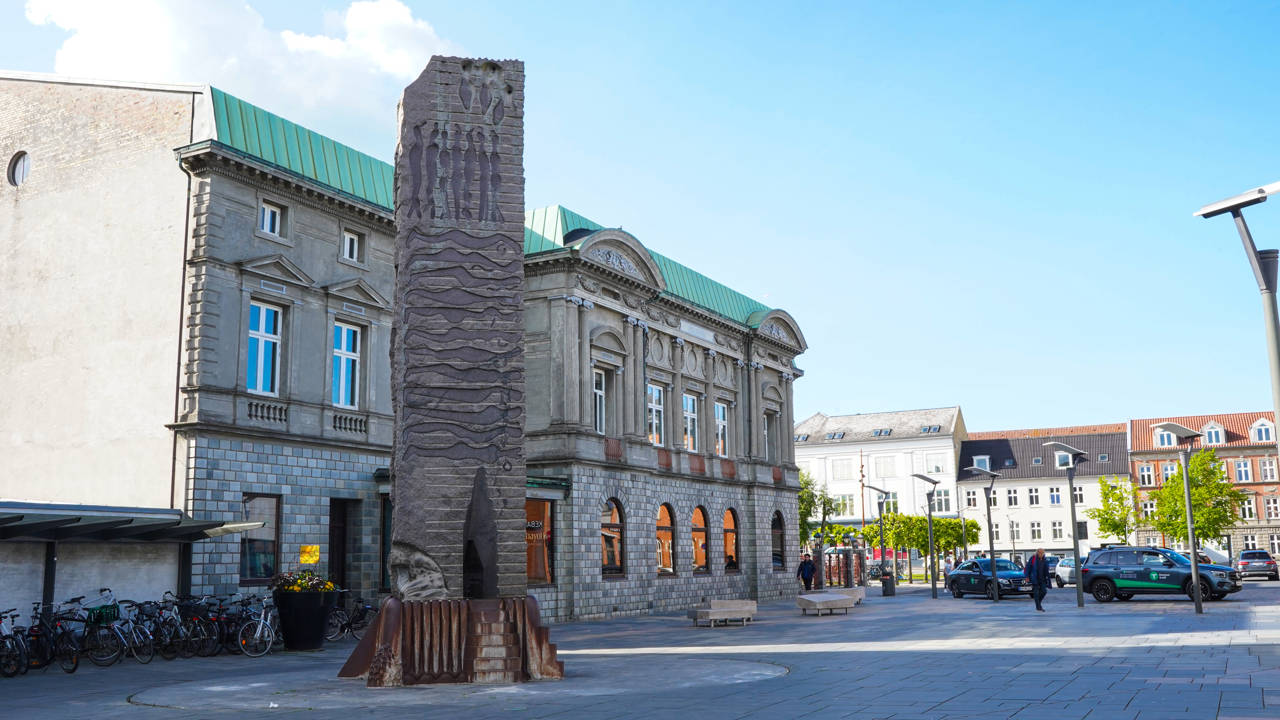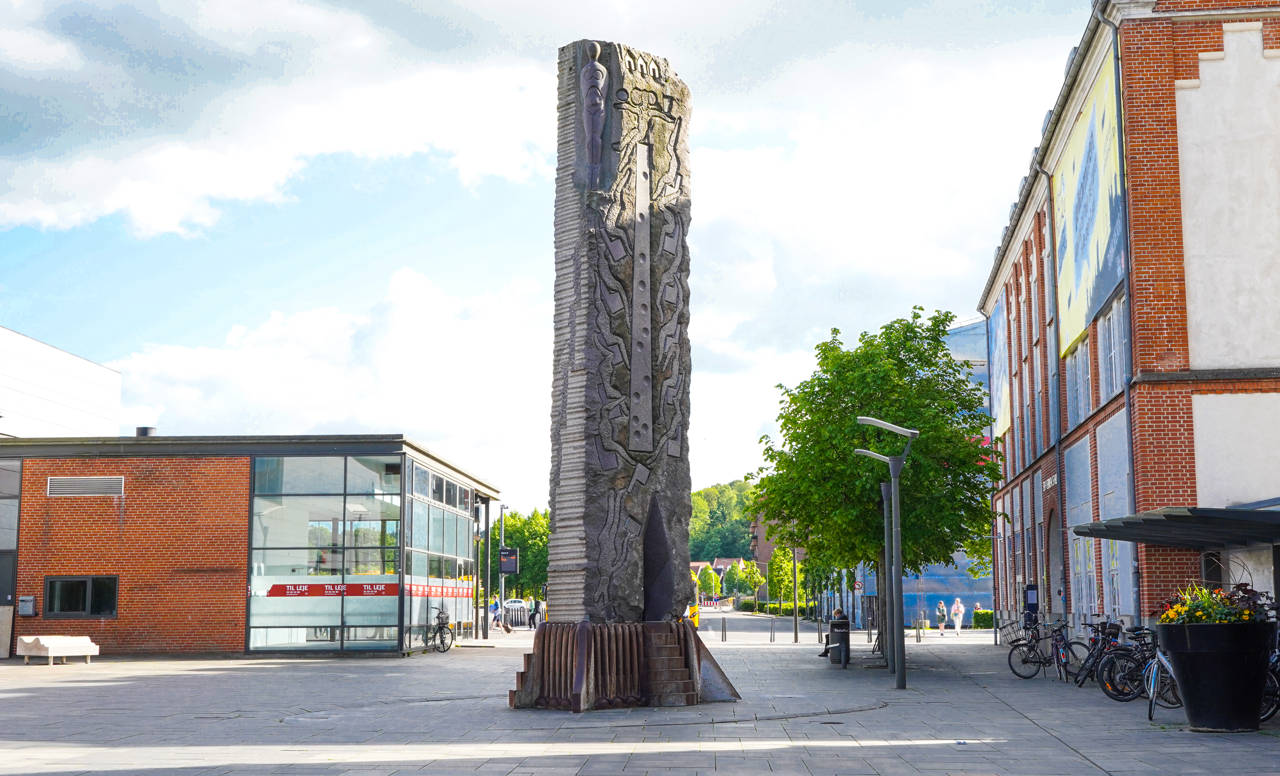 Ud for Vejle Banegårds indgang står skulpturen Himmelstigen - Jacobs drøm.
