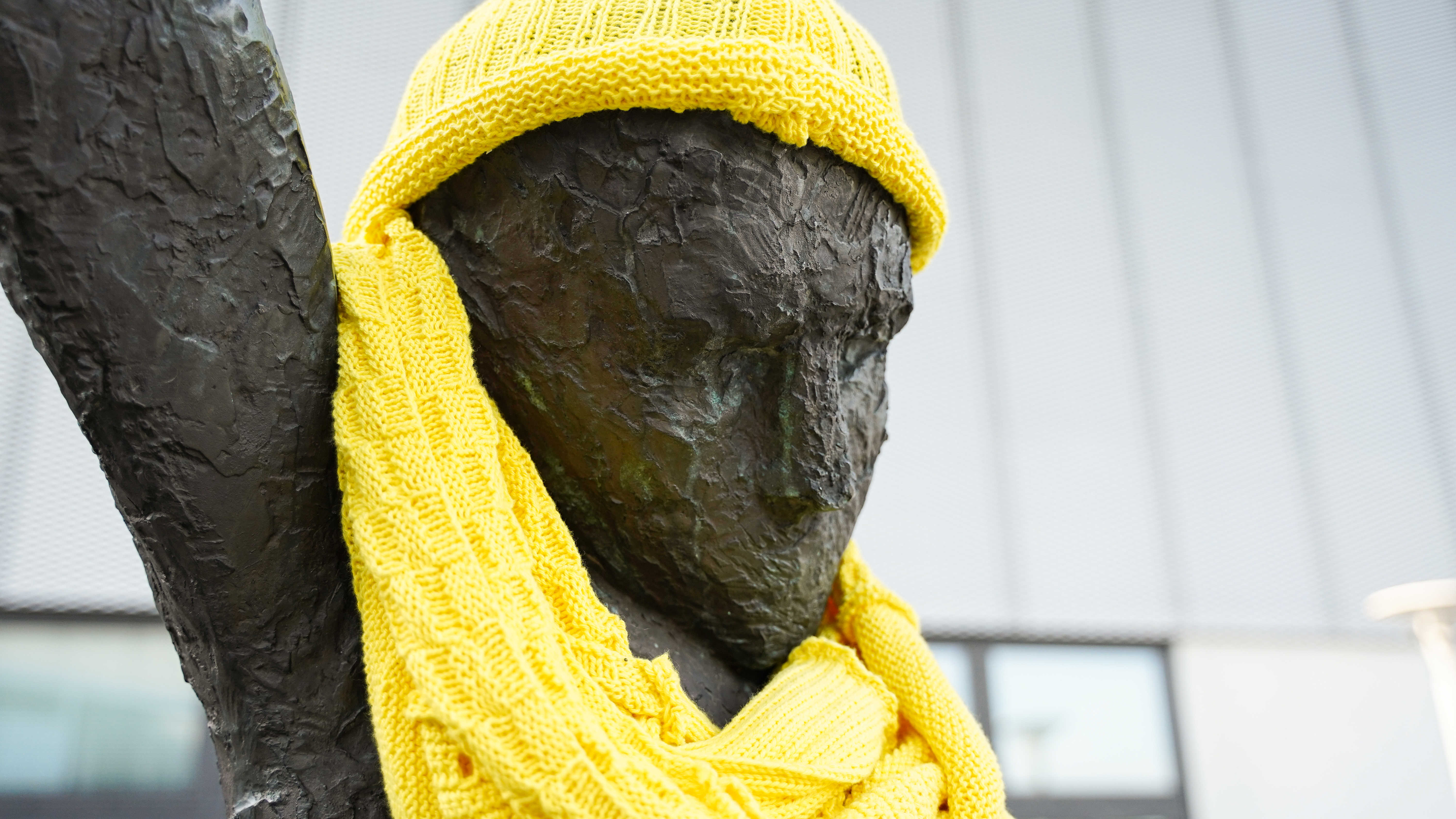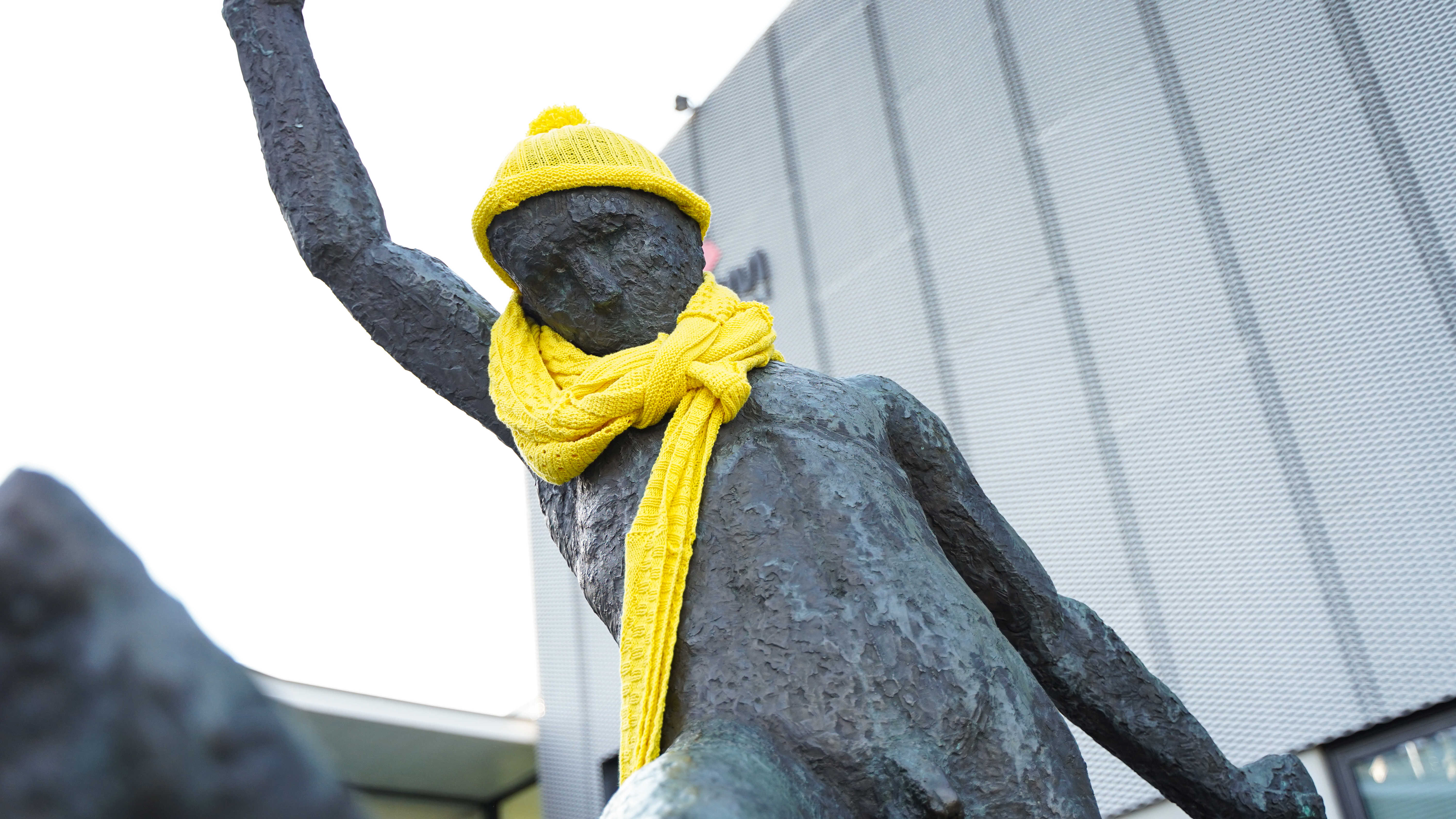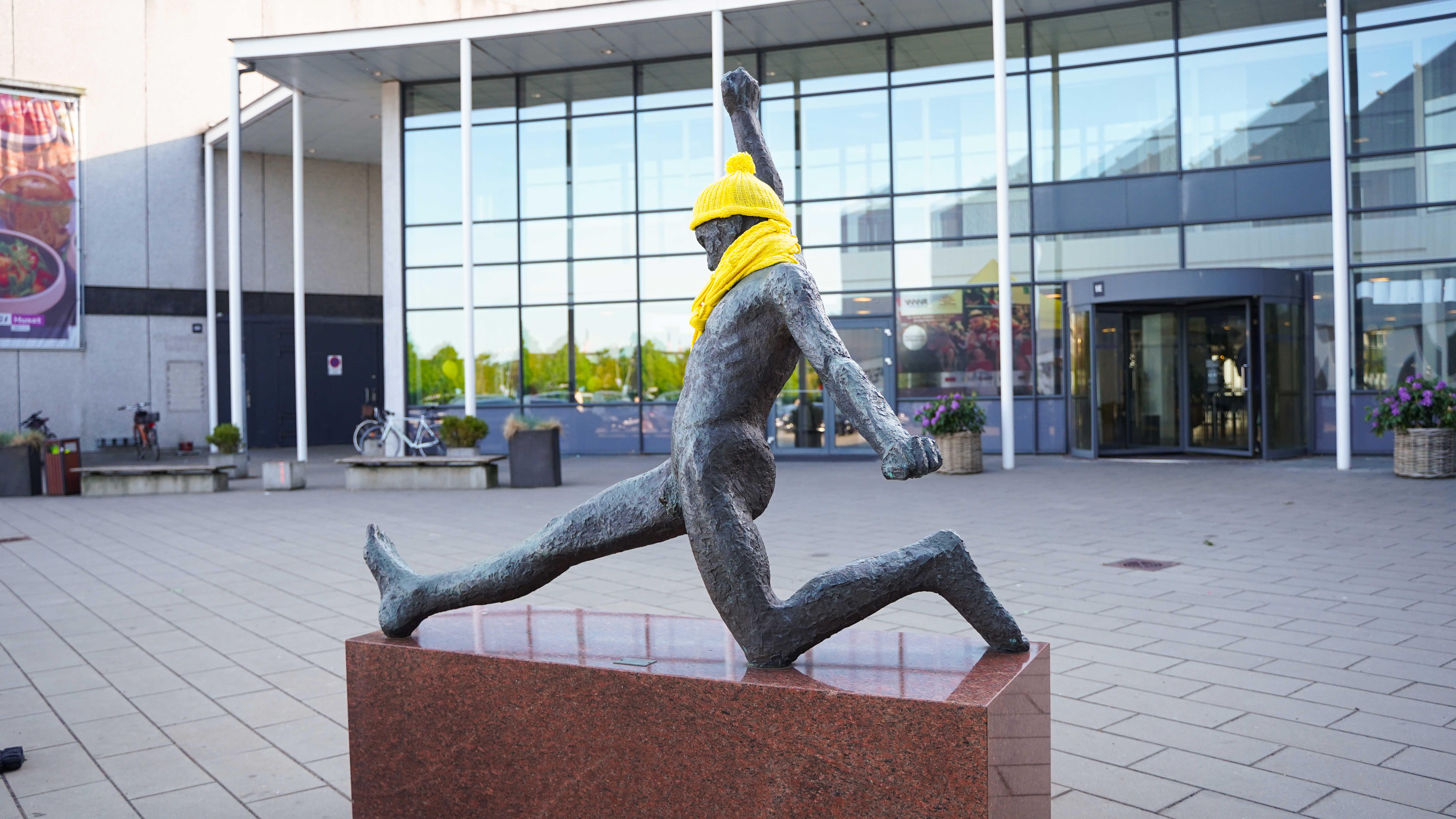 NB: Skulpturen er midlertidigt udsmykket med halstørklæde og hue i gul strik, i forbindelse med Tour de France d. 3. juli 2022.