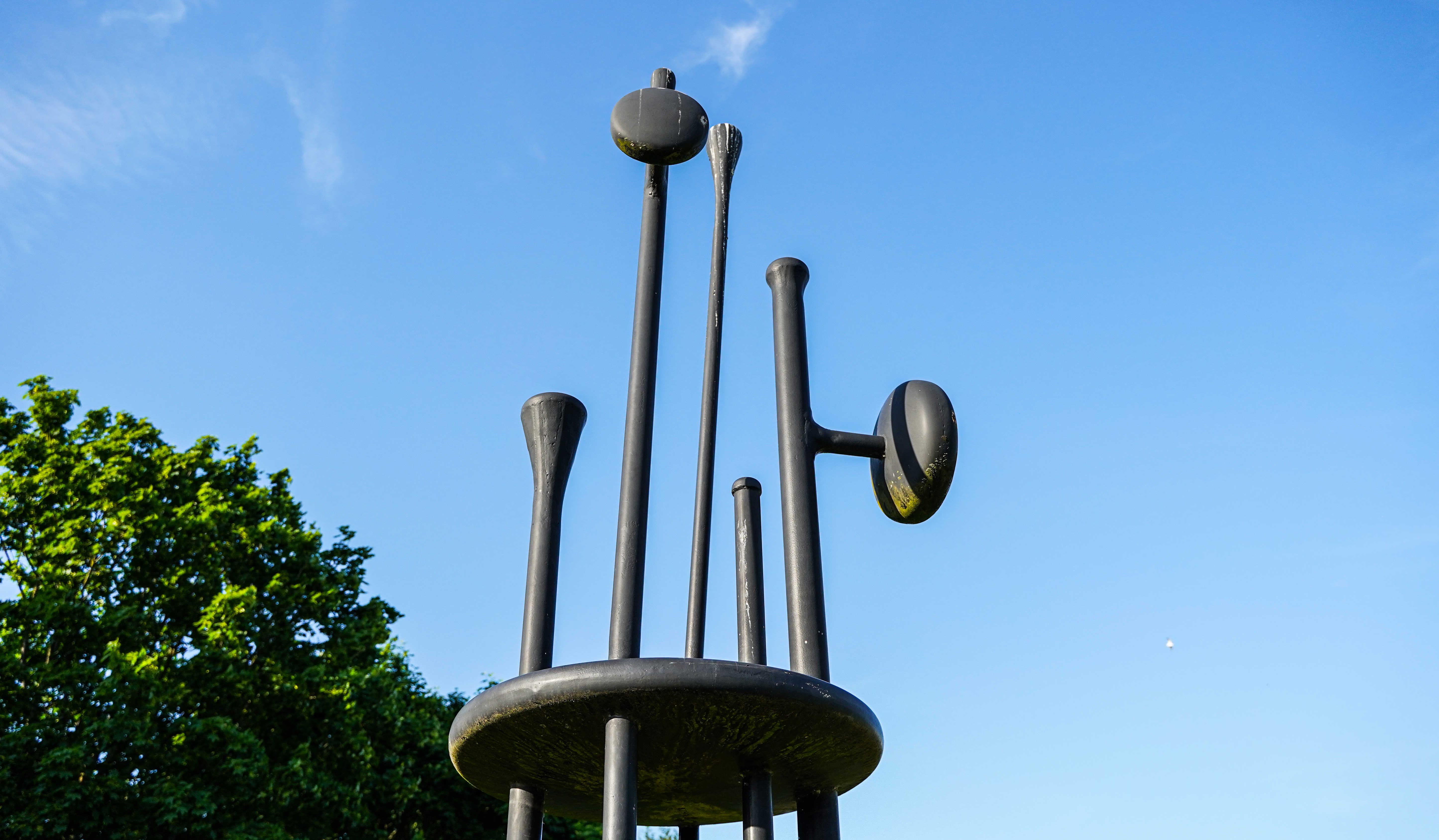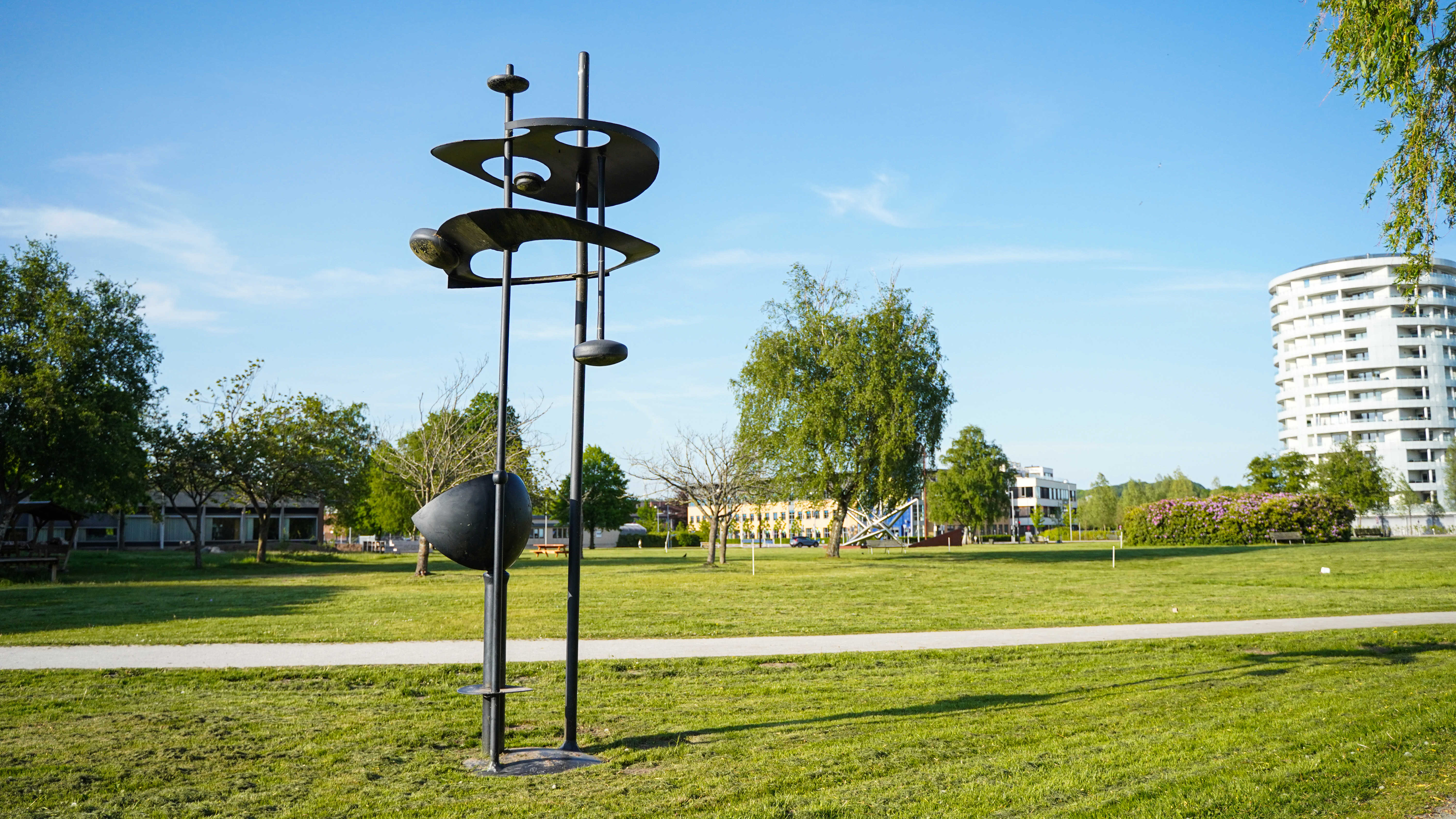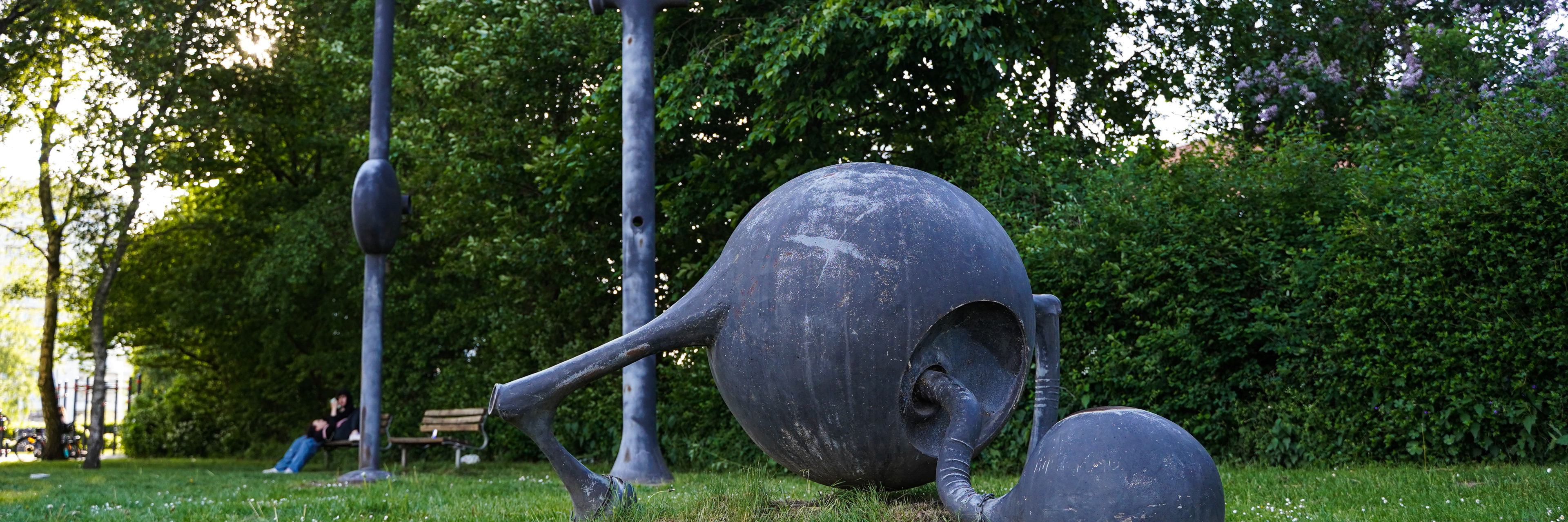 Skulpturgruppen Miljø består af 13 skulpturer, og er udformet dels af lave, kuglerunde former, med lange, tynde rør. Man kan nærmest fornemme et hoved, krop og lemmer på de mange menneskelignende figurer. Nogle af disse figurer kravler og bevæger sig hen over jorden, og lige i nærheden står nogle høje, antennelignende stolper, som ligner, at de kommunikerer ud i rummet. Det skaber en stor kontrast mellem de to typer af figurer - de jordnære, der kravler langs jorden, og de høje slanke, der rækker op imod himlen.