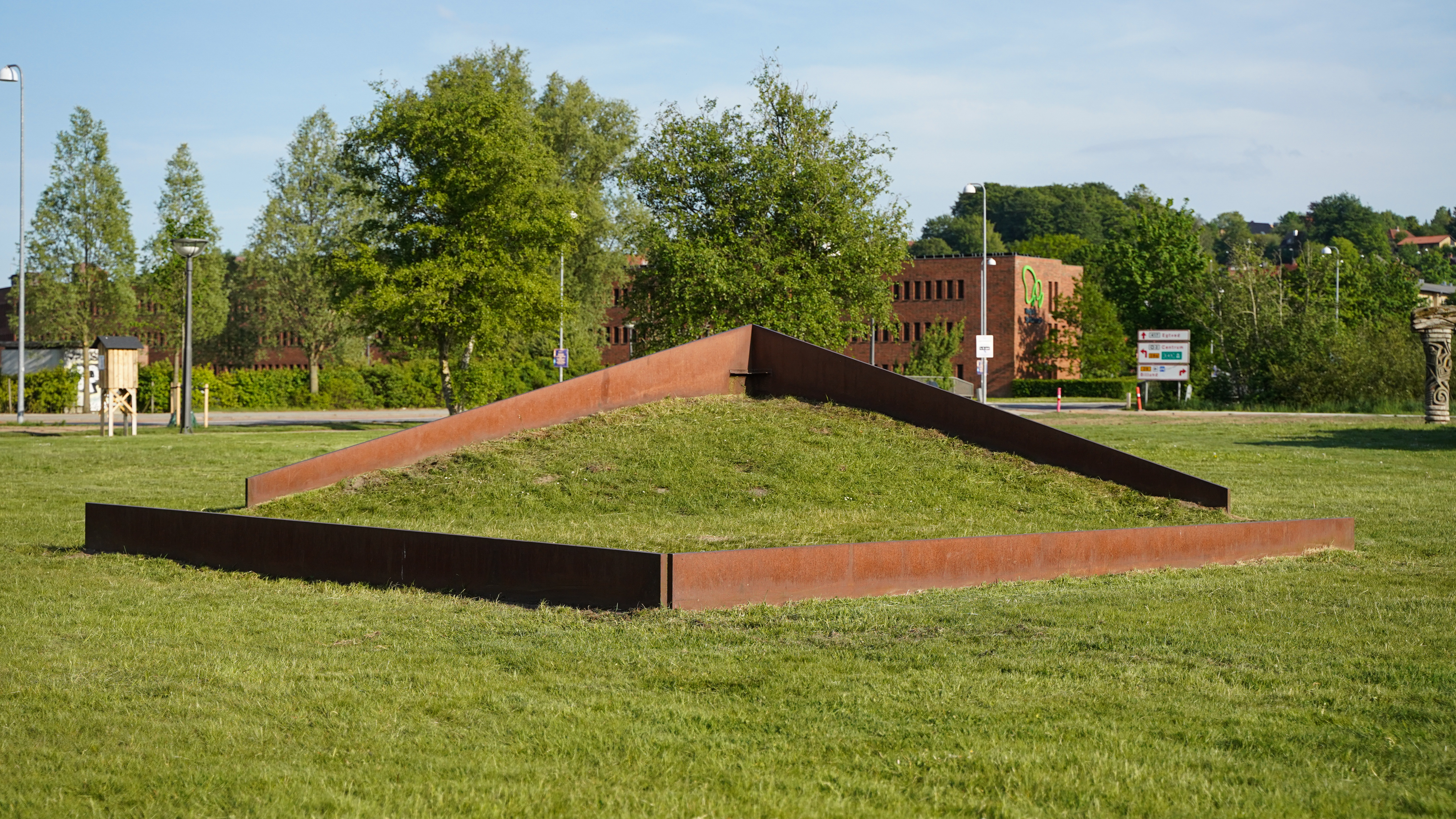 Negative Shift blev skabt i 1987 af den amerikanske kunstner James Reineking, som en kunst-happening i forbindelse med FestiVejle. Siden 1970’erne har Reineking fokuseret på stålskulpturer og oftest med rette vinkler som udgangspunkt. Disse beskæres, bøjes og arrangeres på ny i denne skulptur. De todimensionale linjer omdannes til tredimensionale former. Dermed bliver Negative Shift ved med at bevæge sig fra negativ form til positiv form, der ændrer sig fra firkant til trekant, i takt med at man bevæger sig rundt om skulpturen. Prøv at gå en tur rundt om skulpturen, og se den ændre form i takt med perspektivet.