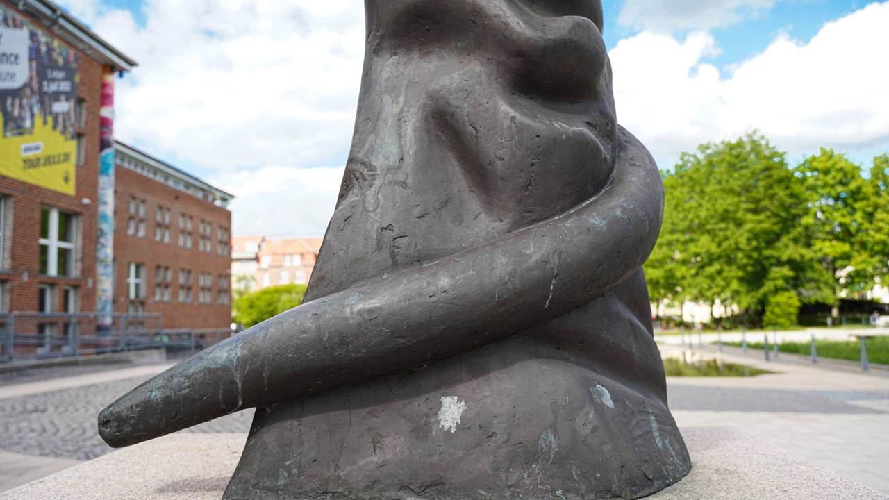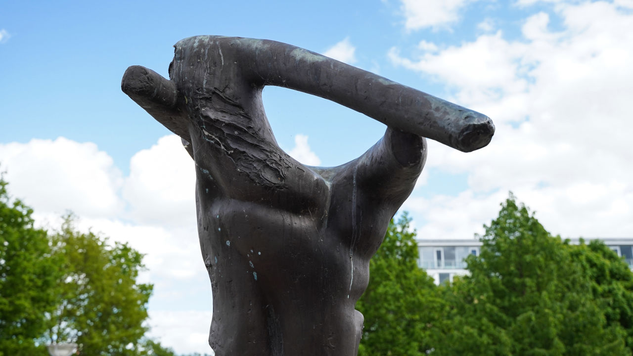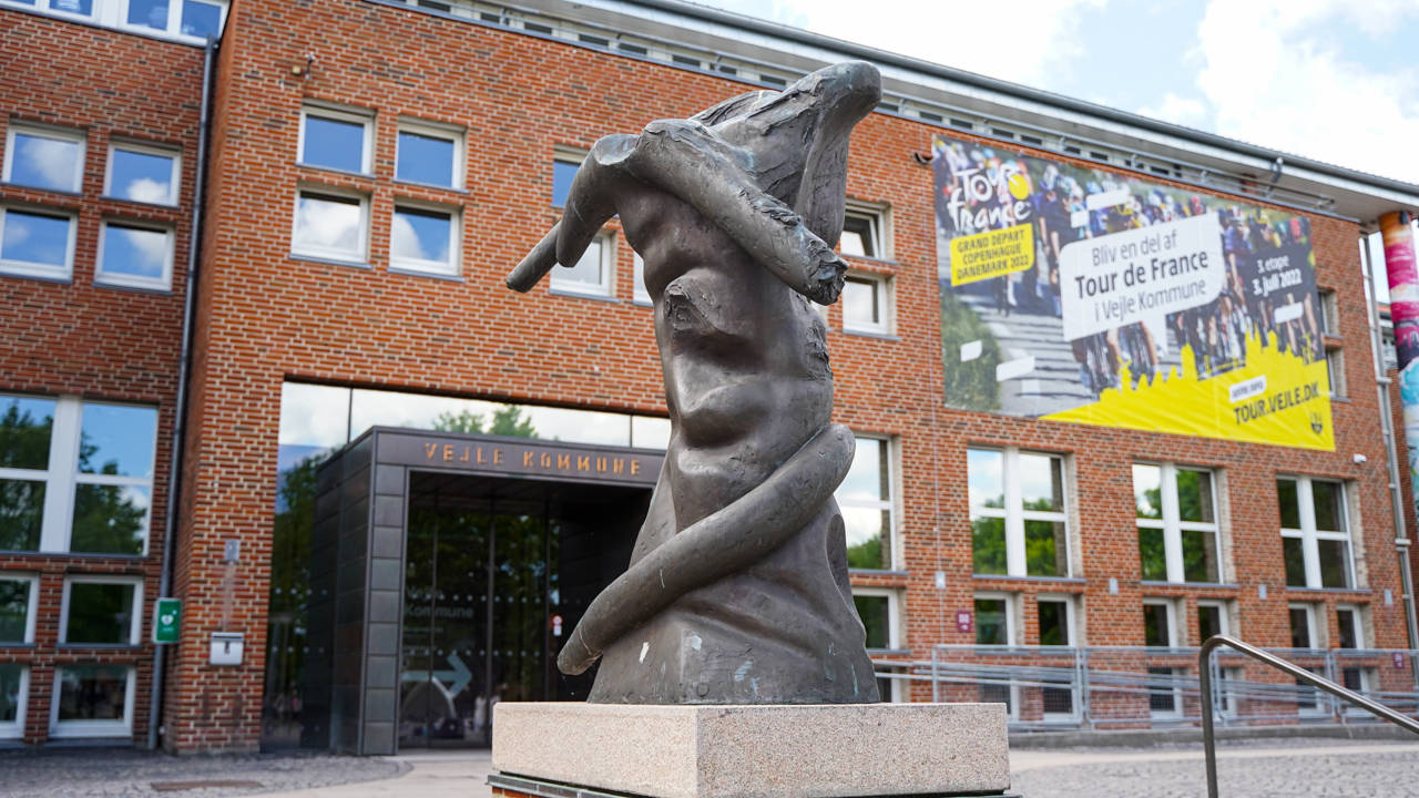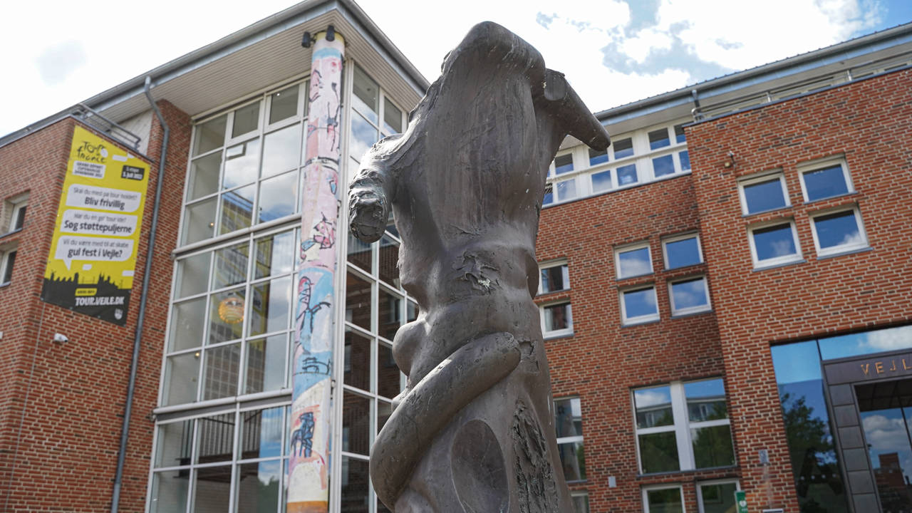 Foran indgangen til Vejle Kommunes administration, står der en to meter høj torso af bronze.