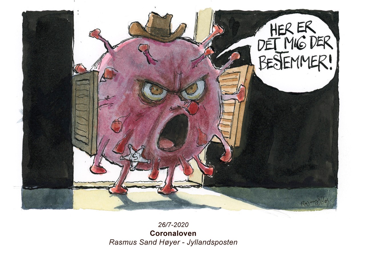 Pandemien set af Danske Bladtegnere. Udstilling på Vejle Bibliotek.
