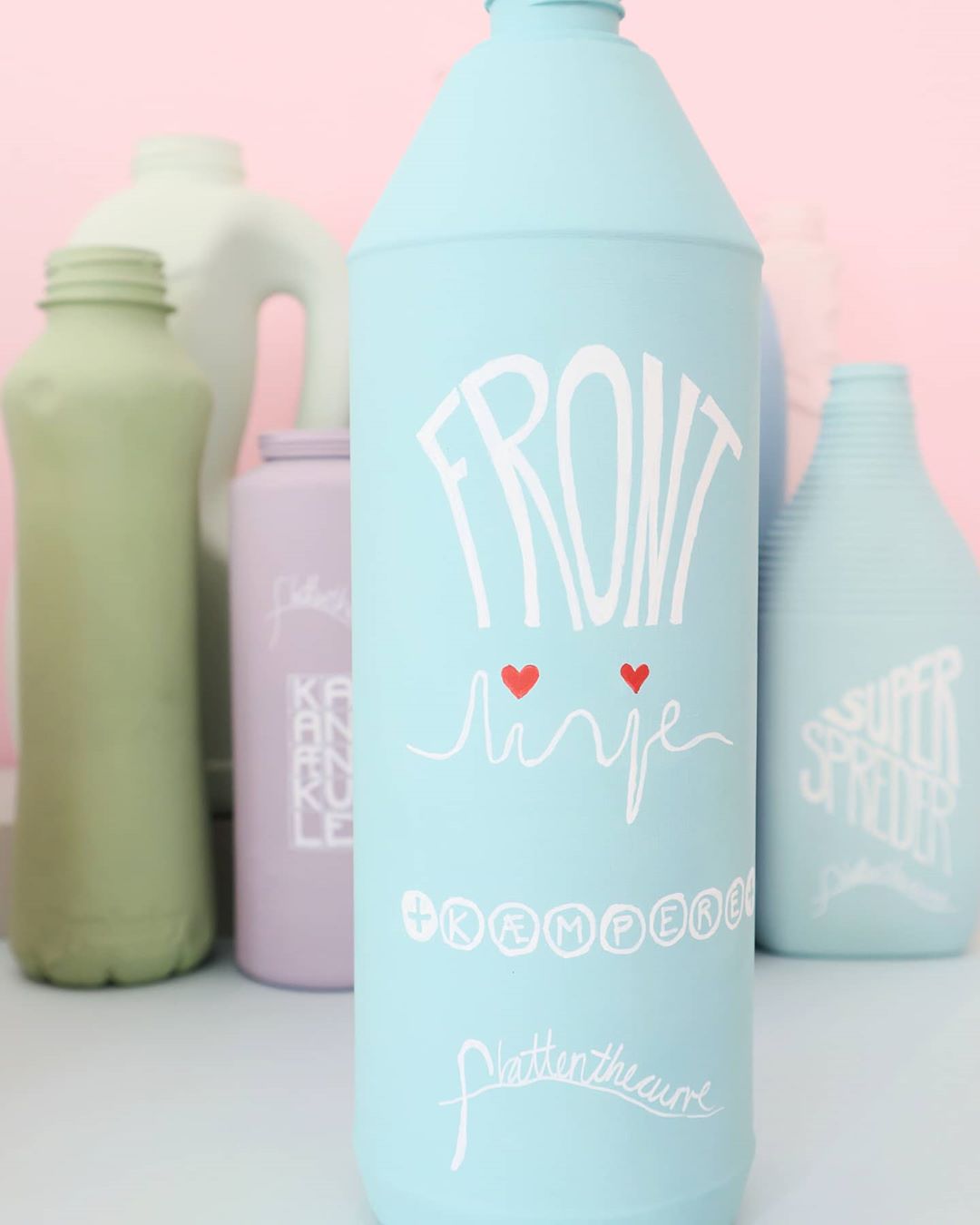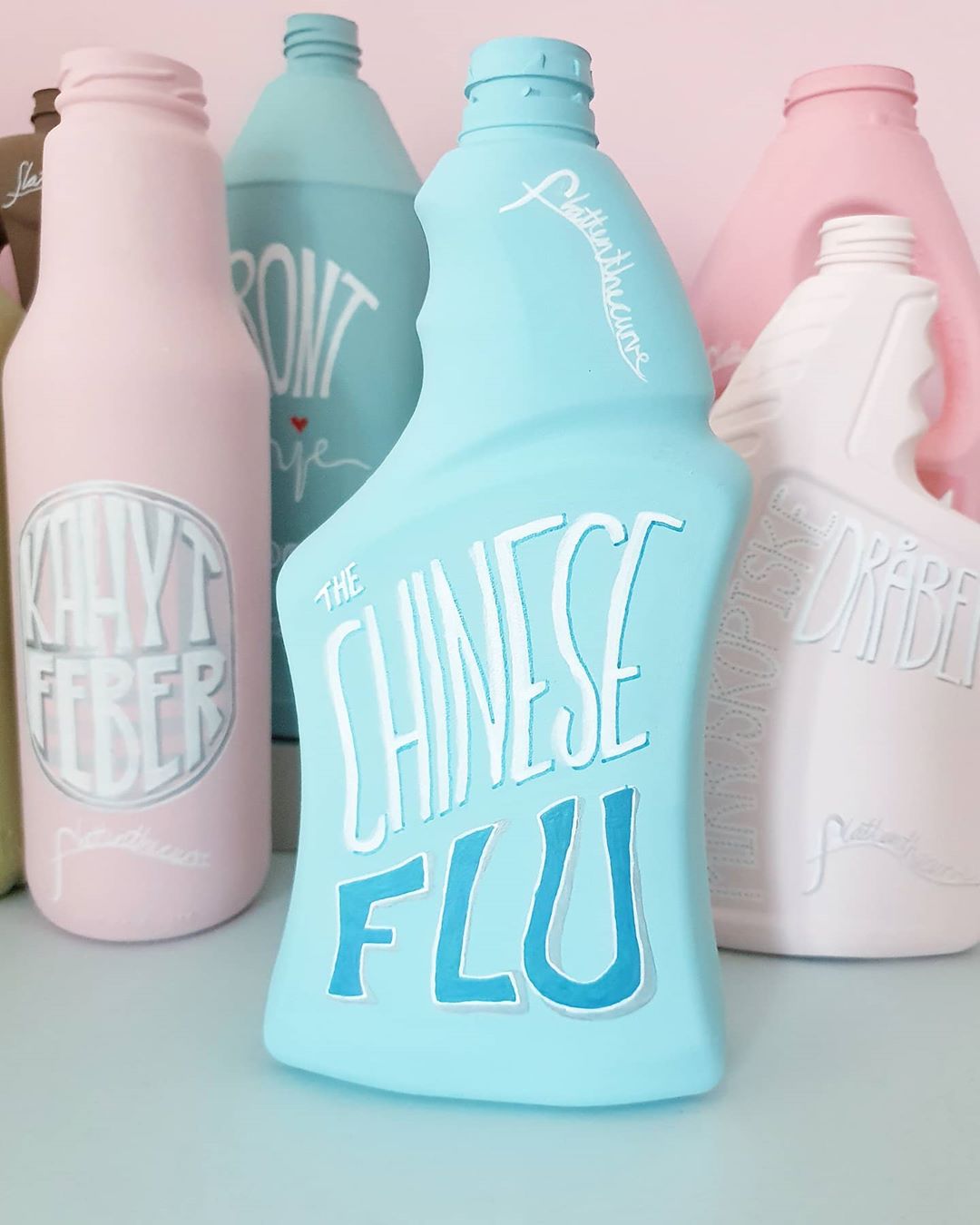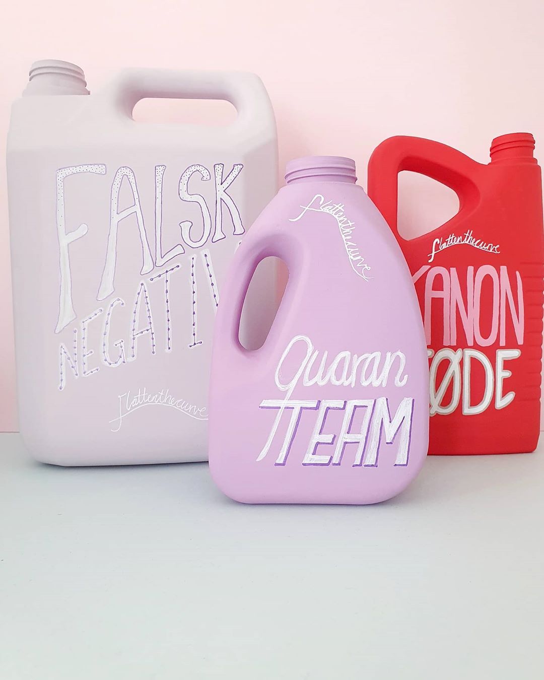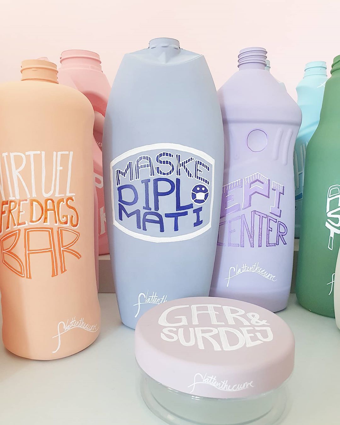 Coronakrisen er en tid, hvor alt er nyt, og vi famler os lidt frem. Der bliver opfundet nye ord og begreber, vi aldrig har hørt om før. Kunstværket viser disse ord som labels på den fiktive rengøringsproducent #FLATTENTHECURVE’s mange produkter. Ord og begreber bliver malet på emballagen og symboliserer en her-og-nu-løsning.