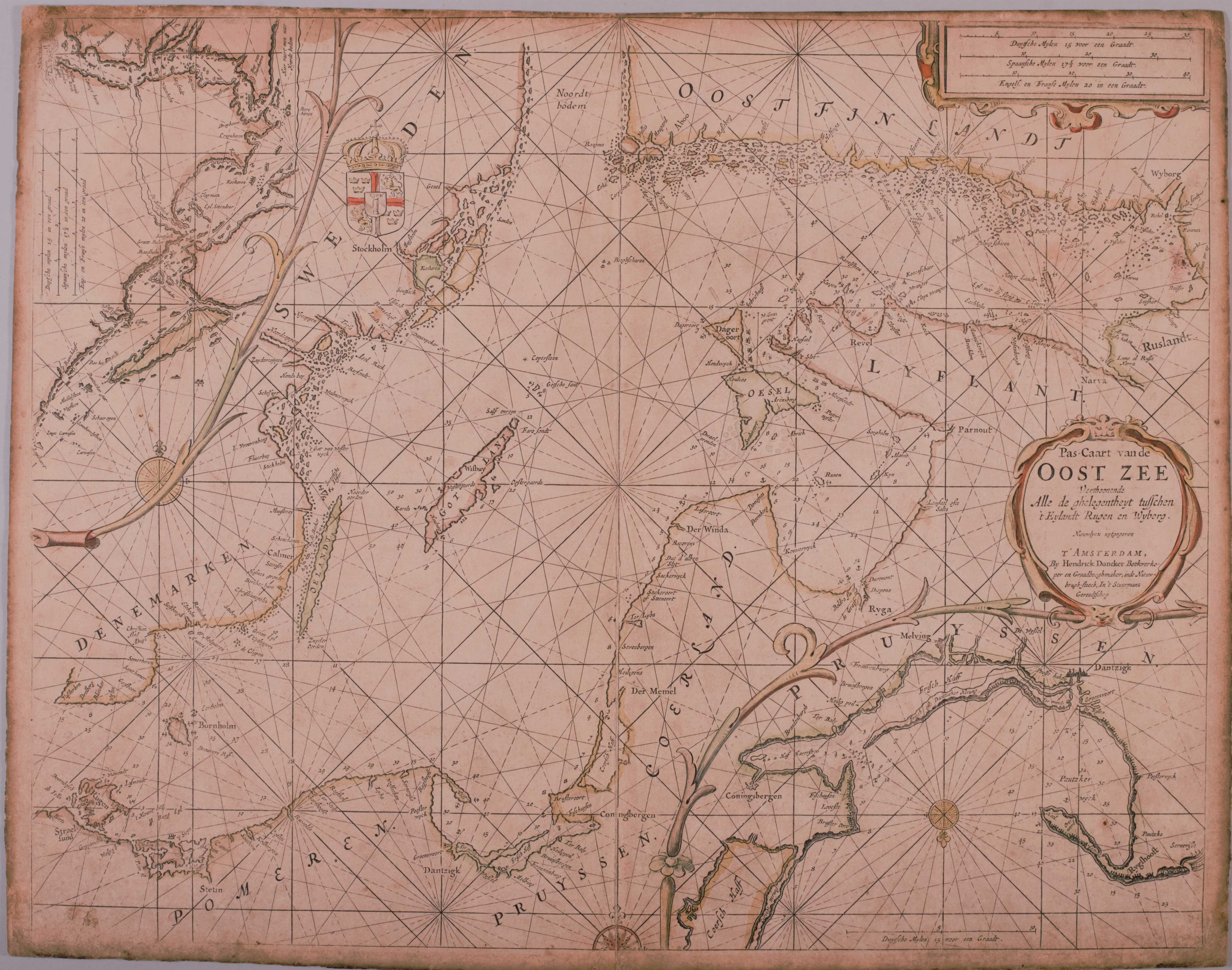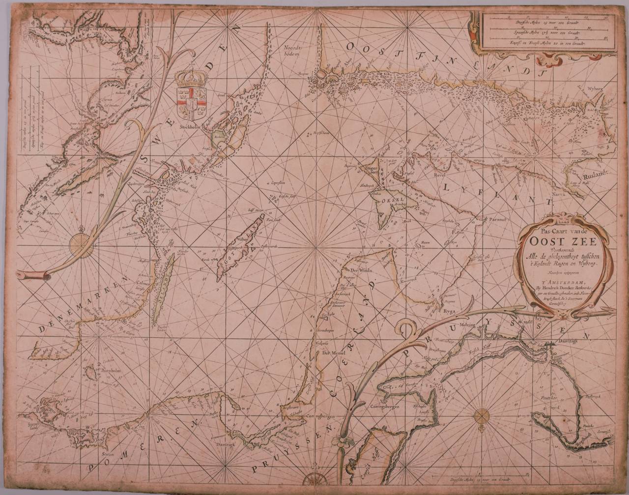 Hendrick Doncker producerede også søkort over Nordsøen og Østersøen, som ses på billederne ovenfor. Bemærk, at det danske rigsvåben er placeret midt i Skåne på trods af, at Danmark havde mistet denne landsdel ni år tidligere. Bemærk også, at kortet over Østersøen i nederste højre og øverste venstre hjørne har et indsejlingskort til den vigtige havneby Danzig indtegnet.